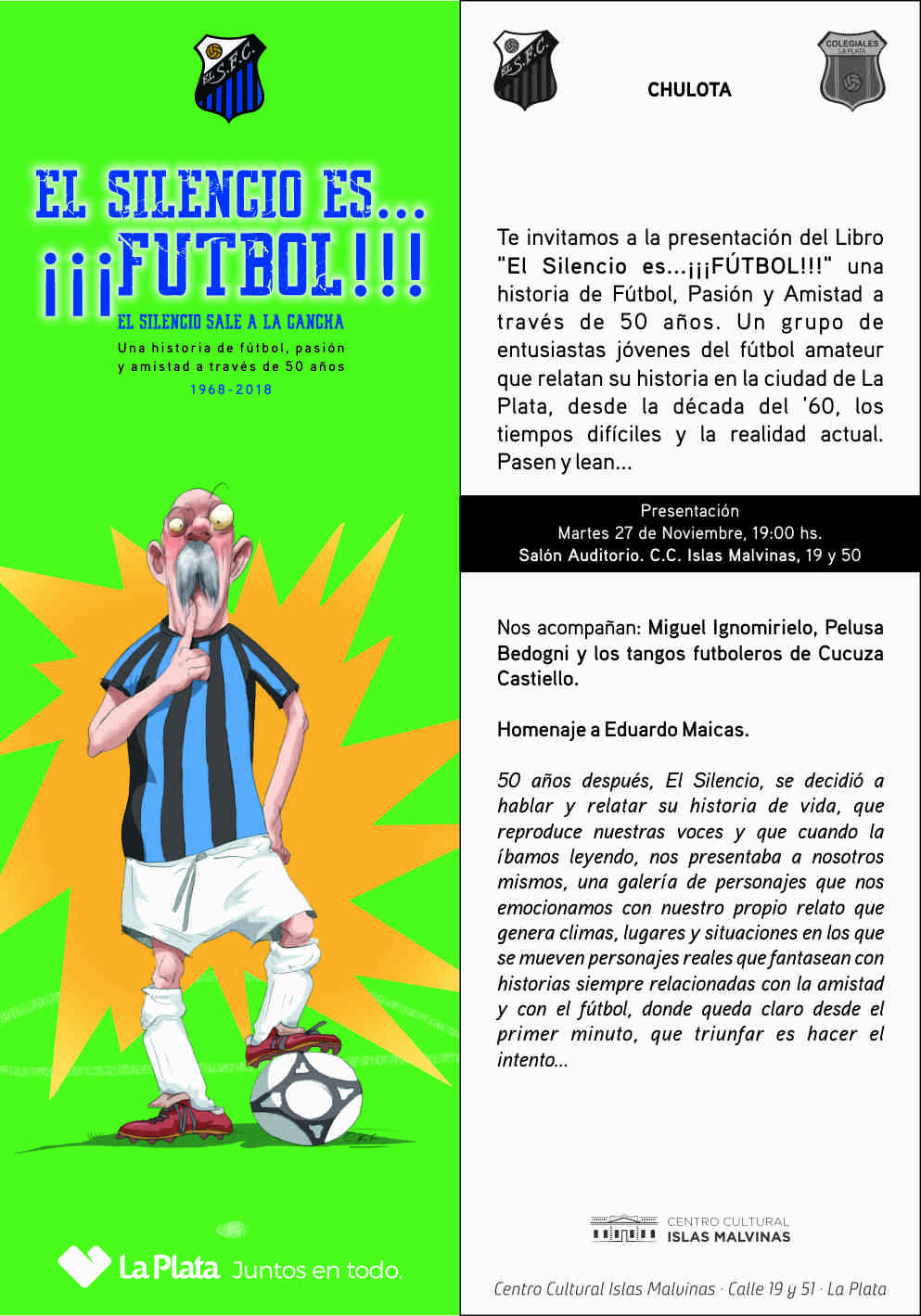 Con entrada gratuita, este martes a las 19 se llevará a cabo la presentación del libro “El silencio es…¡¡¡Fútbol!!!”, de Daniel Sergnese, en el salón Auditorio del Centro Cultural Islas Malvinas (19 y 51). Habrá proyección de videos y un homenaje al humorista gráfico Eduardo Maicas.