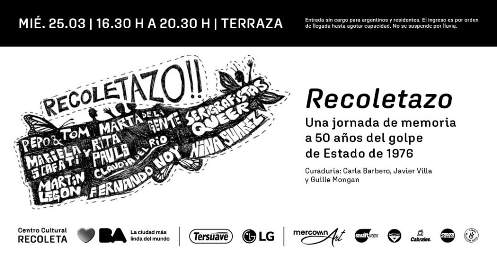 En el marco de los trabajos de memoria, al cumplirse 50 años del golpe de Estado ocurrido en Argentina en 1976, el Centro Cultural Recoleta presentará el 25 de marzo “Recoletazo”, una jornada con la curaduría colectiva de Carla Barbero, Javier Villa y Guille Mongan. La misma consistirá en una acción a lo largo de toda la tarde, en la Terraza del espacio, que cita aquel gesto inaugural de las poéticas políticas locales: el “Siluetazo” (1983). Esta jornada artística se plantea como un espacio para interrogar las huellas de la historia en los cuerpos, las estéticas que esas marcas producen y las estrategias que el arte contemporáneo pone en juego para pensarlas en el presente.