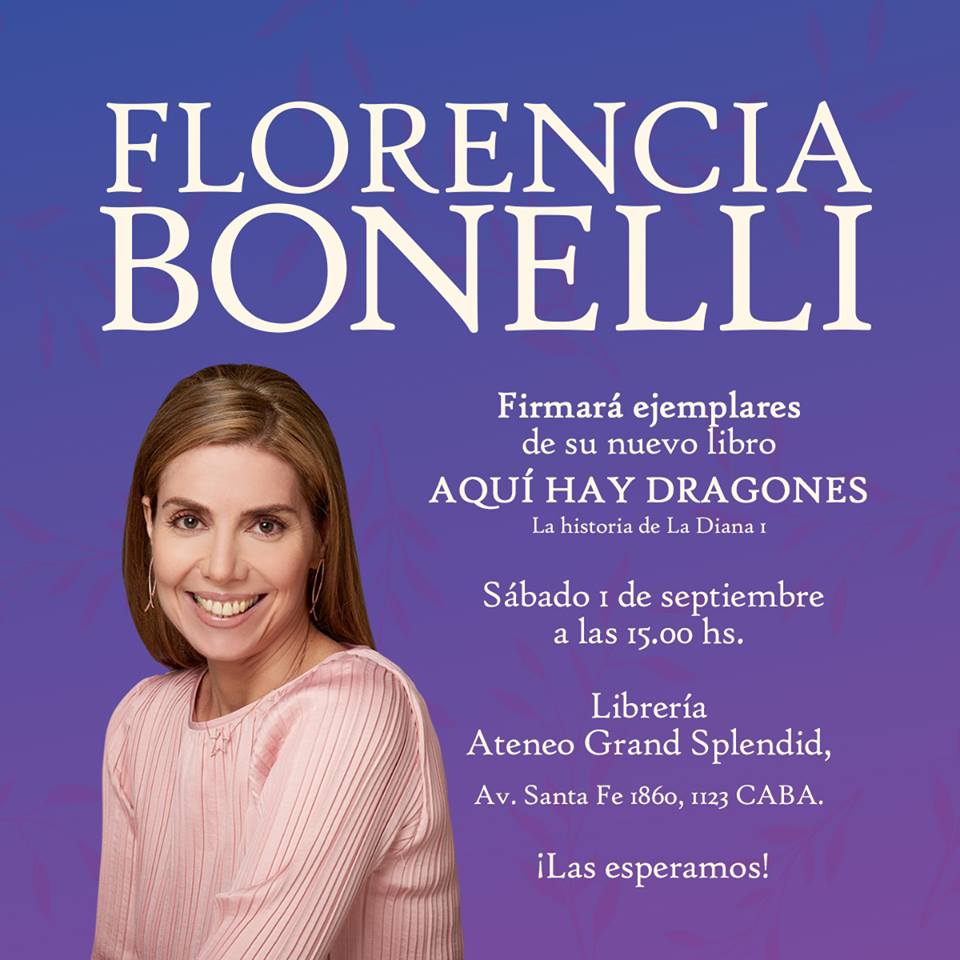 La novedad se hizo pública este lunes, y la autora ya lo había adelantado durante el Festival Historias que Enamoran, en el Centro Cultural Borges, el pasado sábado: la nueva novela de Florencia Bonelli, que se presentará el próximo 1º de septiembre, se llamará “Aquí hay dragones – La historia de La Diana I”.