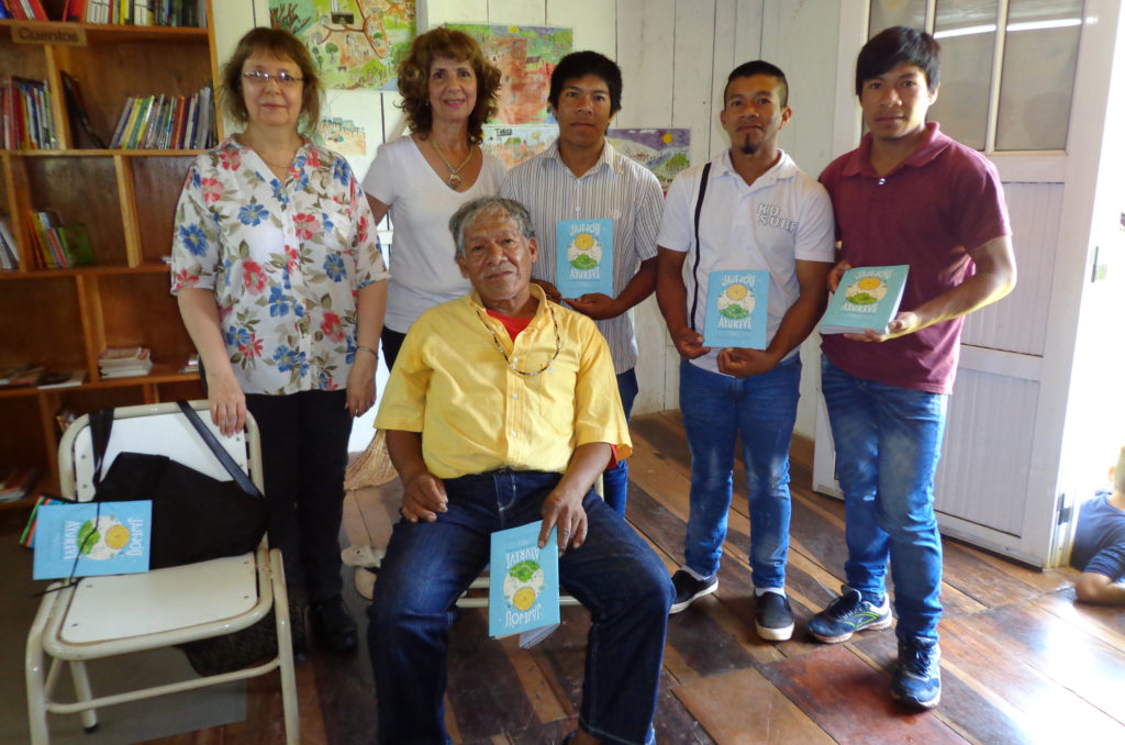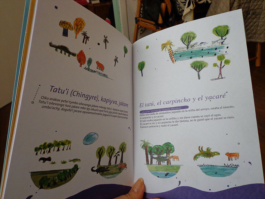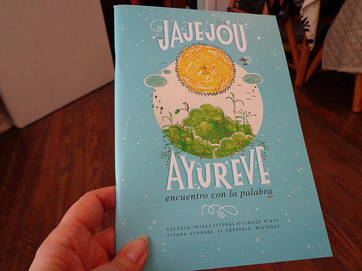 Otra parte del proyecto fue lograr que el material tuviera forma de libro, pasar de la oralidad a la palabra escrita. Este proyecto multicultural fue una ardua y hermosa tarea. El director Diego Carballo, el cacique Vicente Méndez y la profesora Pamela Barboza planificaron. La comunidad quiso investigar, recuperar y poner en valor su cultura, su identidad. Y fuimos armando un libro con canciones, cuentos, costumbres y naturaleza en la vida del pueblo mbya guaraní, escrito e ilustrado por los alumnos y alumnas de la escuela. Los alumnos escribieron e ilustraron aportando sus saberes en mbya guaraní, portugués y castellano. Todos disfrutamos del material recopilado oralmente con la ayuda de Marcos Méndez, Vicente Méndez y Don Germán Méndez. Una vez que estuvo el borrador del libro se buscó el apoyo de Patricia Pereyro y el equipo de Coincidir Asociación Civil, y fue diseñado y editado por los alumnos de la profesora María Laura Garrido de la Carrera de Edición de Fundación Gutemberg. En marzo de este año fuimos a Misiones, a la comunidad, a presentar y a entregar los ejemplares del libro bilingüe editado.