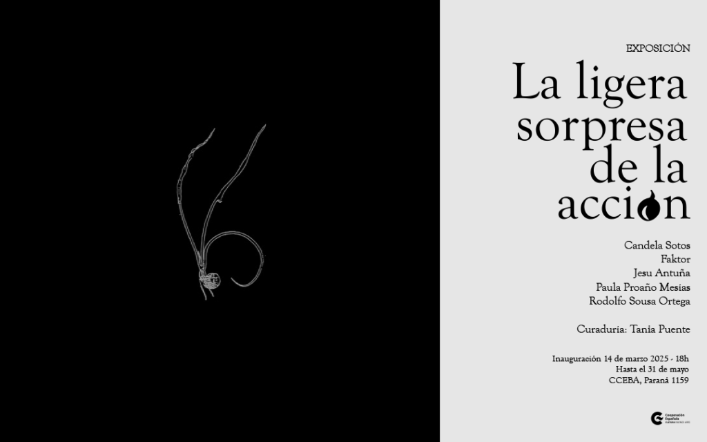 “La ligera sorpresa de la acción” (sala II), curada por Tania Puente (México) está integrada por obras de Jesu Antuña (España), Faktor (Argentina), Paula Proaño Mesías (Ecuador), Candela Sotos (España) y Rodolfo Sousa Ortega (México).