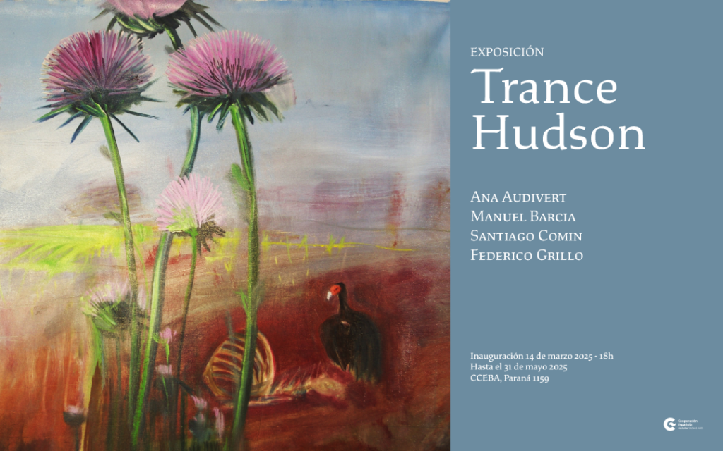 “Trance Hudson” (sala III) nace del interés de los artistas: Ana Audivert, Manuel Barcia, Santiago Comin y Federico Grillo en torno a la figura de Guillermo Hudson, escritor y naturalista que nació en Argentina en 1841 donde vivió hasta sus 33 años. A través de fotografías, pinturas y un universo sonoro, el grupo artístico convoca a los visitantes – guiados por la narrativa de Hudson – a reflexionar sobre el territorio y los cambios que el paisaje soporta.