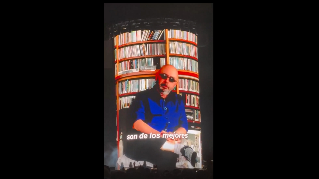 Según publicó la Agencia Noticias Argentinas, mientras la banda repasaba gran parte de su repertorio, el estadio quedó en silencio cuando el músico irrumpió en las pantallas gigantes.
