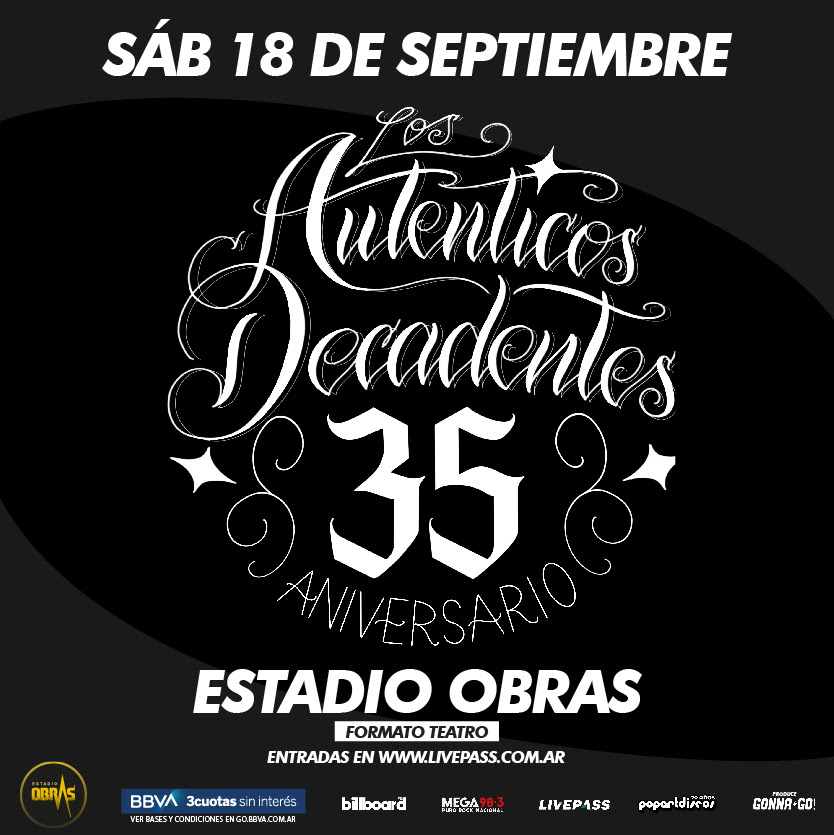 La banda Los Auténticos Decadentes festejará sus 35 años de historia el sábado 18 de septiembre en estadio Obras, donde ofrecerá un concierto que marcará su reencuentro con su público y en el que hará un recorrido por su carrera y adelantará canciones de su próximo disco.