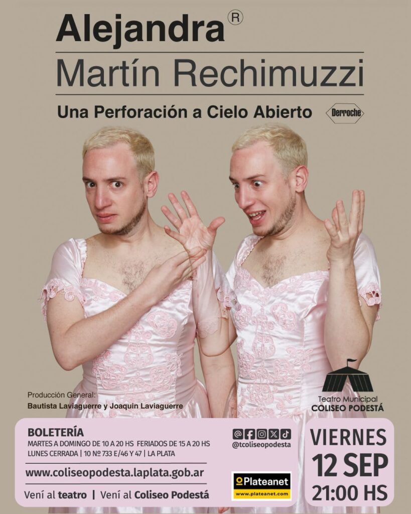 El talentoso politólogo y artista argentino Martín Rechimuzzi llega con “Alejandra, una Perforación a Cielo Abierto “. La obra es una comedia en 3 actos sobre las distintas formas que puede cobrar la locura. A partir de su propia historia reciente, Martín Rechimuzzi escenifica el delirio que sucede al interior de muchas familias en la actualidad.