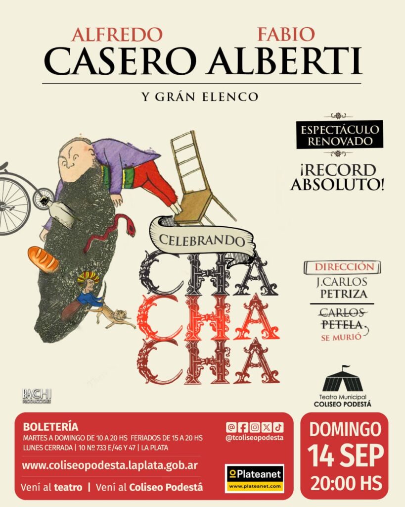 Con producción de Giuliano Bacchi, Cha Cha Cha revalidó su vigencia con una propuesta escénica original, provocadora y celebrada por la crítica y el público. El espectáculo viene sumando funciones a sala llena, ovaciones y una comunidad de espectadores que, entre la nostalgia y la sorpresa, se reencontraron con un estilo de humor que sigue vigente por su irreverencia, su capacidad de crítica social y su mirada tan aguda como absurda sobre la realidad. Personajes emblemáticos como Juan Carlos Batman, Susana Bronstein, Peperino Pómoro, o Boluda Total entre otros, vuelven a cobrar vida en cada función convirtiéndolo en una experiencia distinta, con sketches que rotan y se actualizan, manteniendo fresca la propuesta y descolocando al espectador con una risa inesperada. Alfredo Casero y Fabio Alberti lideran un elenco potente, todos bajo la dirección del propio Casero.