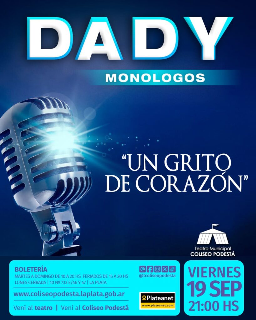 Viernes 19- 21:00 horas DADY MONÓLOGOS, UN GRITO DE CORAZÓN, con Dady Brieva Stand up-humorístico/ APTA + 13 años