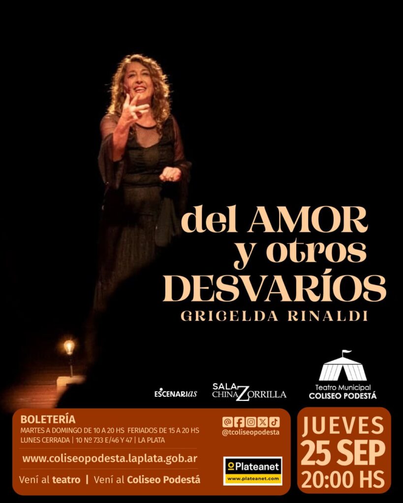 Jueves 25- 20:00 horas DEL AMOR Y OTROS DESVARIOS, con Gricelda Rinaldi Sala China Zorrilla Tango/ APTA + 15 años