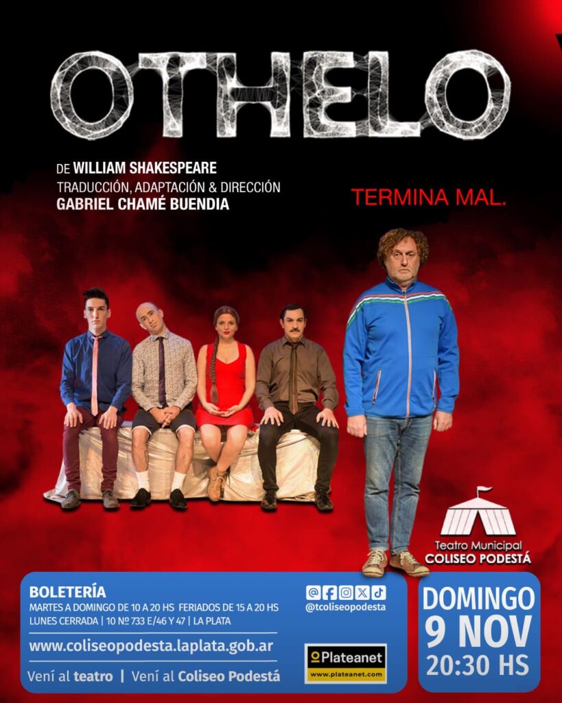 Othelo es un espejismo maléfico en el que acercándote no ves más que arena, o tu propia tragicomedia”. Gabriel Chamé BuendiaActuaciones: Matías Bassi, Elvira Gómez, Nicolás Gentile, Agustín Soler. Autor: William Shakespeare. Adaptación, traducción y dirección: Gabriel Chamé Buendia