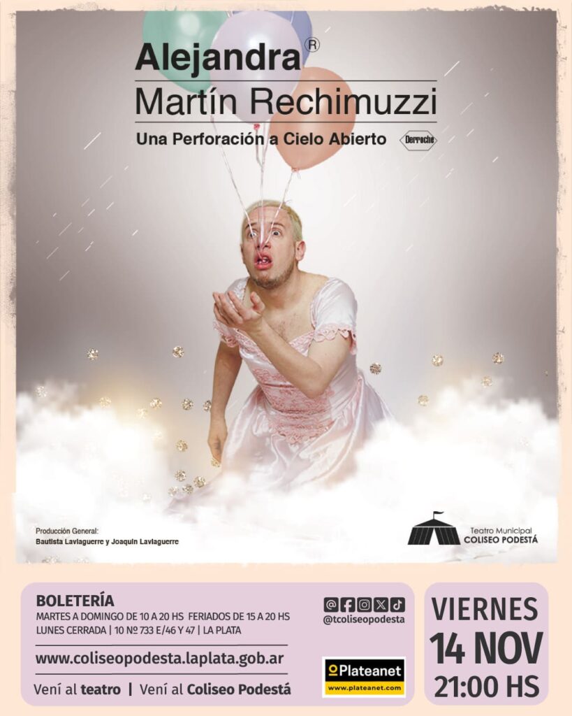 El talentoso politólogo y artista argentino Martín Rechimuzzi llega con “Alejandra, una Perforación a Cielo Abierto “. La obra es una comedia en 3 actos sobre las distintas formas que puede cobrar la locura. A partir de su propia historia reciente, Martín Rechimuzzi escenifica el delirio que sucede al interior de muchas familias en la actualidad.