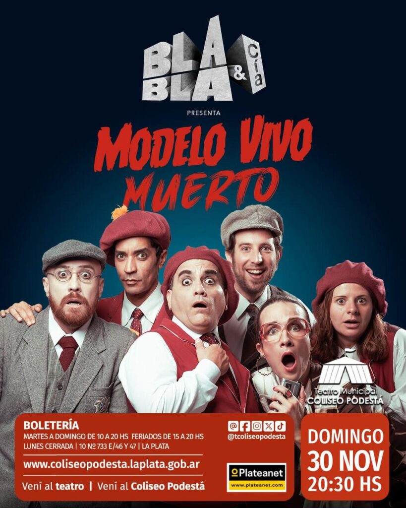 Durante el año 2023, convocados por la Sala Caras y Caretas, los integrantes de la Compañía Bla Bla se lanzaron a producir por primera vez una pieza teatral en formato de obra clásica en tres actos, rompiendo con sus tradicionales sketches de varieté. Sumando nuevos colaboradores a su equipo, crearon “Modelo Vivo Muerto” bajo la dirección de Francisca Ure. Desde su estreno en abril del 2023 llevan realizadas con “Modelo Vivo Muerto” más de 150 funciones en teatros de CABA, Gran Buenos Aires, Mar del Plata, Rosario, Rafaela y Mendoza.