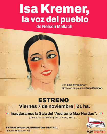 “Isa Kremer, la voz del pueblo”, el rectal biográfico para cantante, piano, violín, cello, clarinete y acordeón, se presentará el viernes 7 de diciembre a las 21 en el Centro Literario Israelita y Biblioteca Max Nordau, de calle 11 nº 1272 (58 y 59) de La Plata. La obra tendrá también funciones el domingo 16 a las 20.30 y los viernes 21 y 28 a las 21, todas con entradas a la venta a través de Alternativa Teatral.
